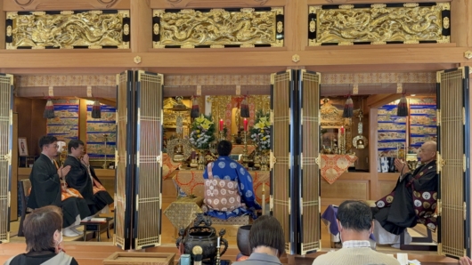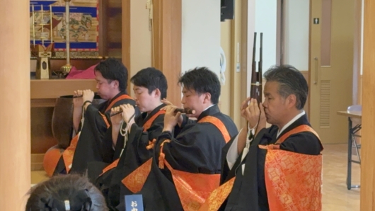 13時からの午後の部は、5年ぶりに雅楽の演奏を入れました。那珂組白鵠会(なかそびゃっこうかい)の皆様に演奏していただきながら、副住職が導師を勤めました。お勤めは正信偈(行譜)でした。荘厳な雰囲気の中、有難いご縁でした。