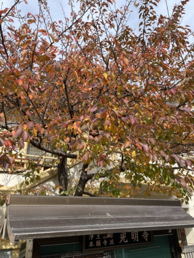 12月に入り、季節は、すっかり冬になりました。境内の桜の木もようやく色づきました。